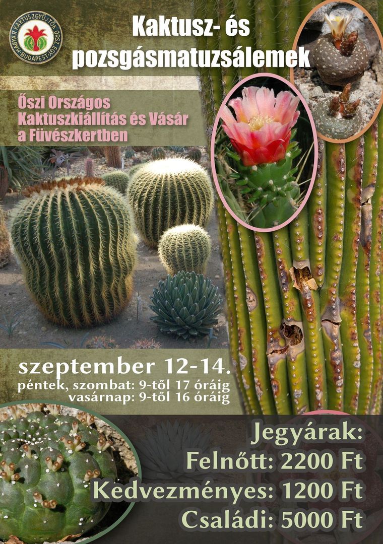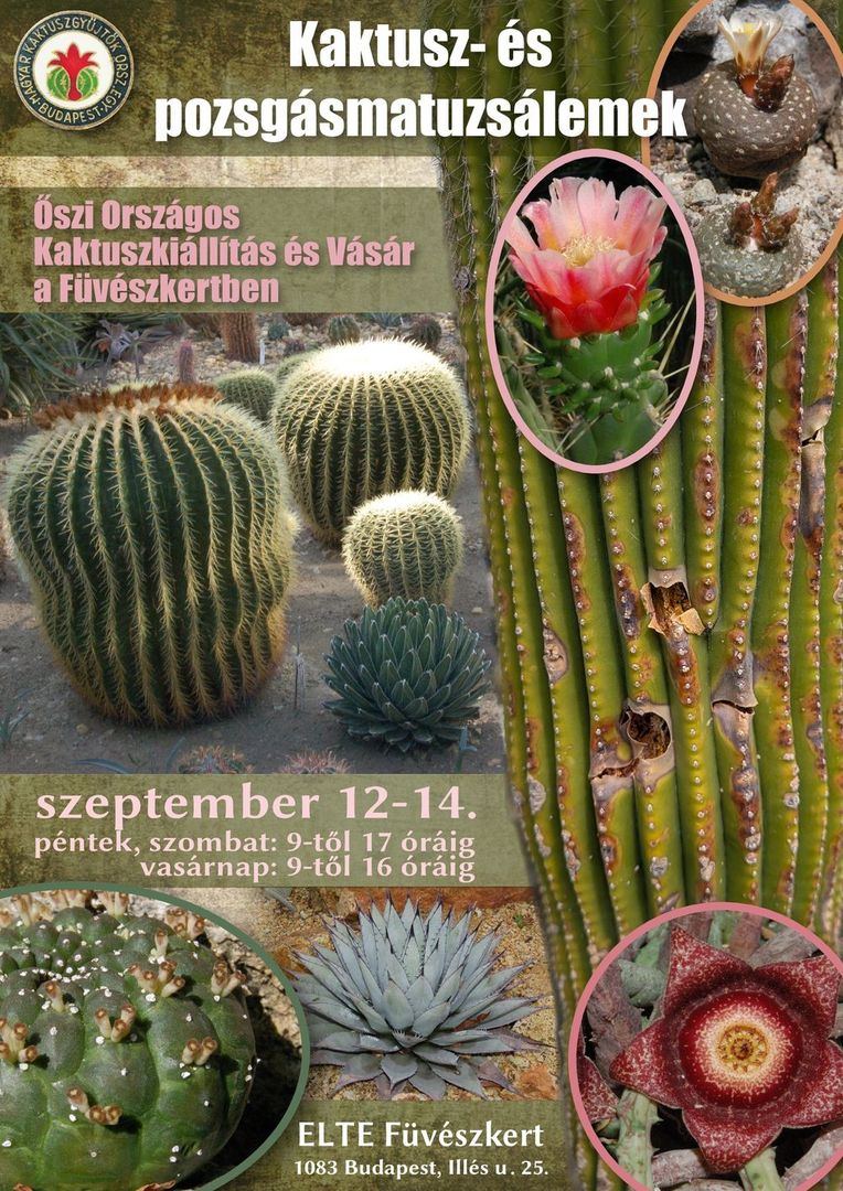 A Magyar Kaktuszgyűjtők Országos Egyesülete őszi kiállítását ezúttal az idős korú, nagyméretű vagy terjedelmes telepeket alkotó kaktuszok és pozsgások bemutatásának szenteli.